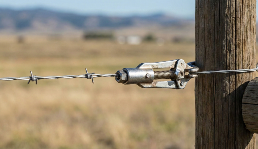 Amarra el alambre al poste de esquina inicial y coloca el tensador mecánico en el otro extremo. Tensa gradualmente hasta que el alambre quede firme como cuerda de guitarra pero sin exagerar — si lo tensas demasiado se puede reventar con el calor del verano. La prueba: debe hacer un sonido metálico al golpearlo.