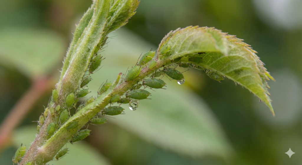 Son pequeños insectos de cuerpo blando que pueden ser verdes, negros, amarillos o rojos. Se agrupan en colonias en hojas nuevas, brotes y tallos tiernos. Succionan la savia de la planta causando hojas enrolladas, amarillentas y deformadas. Además secretan una sustancia pegajosa llamada melaza que atrae hormigas y hongos.
