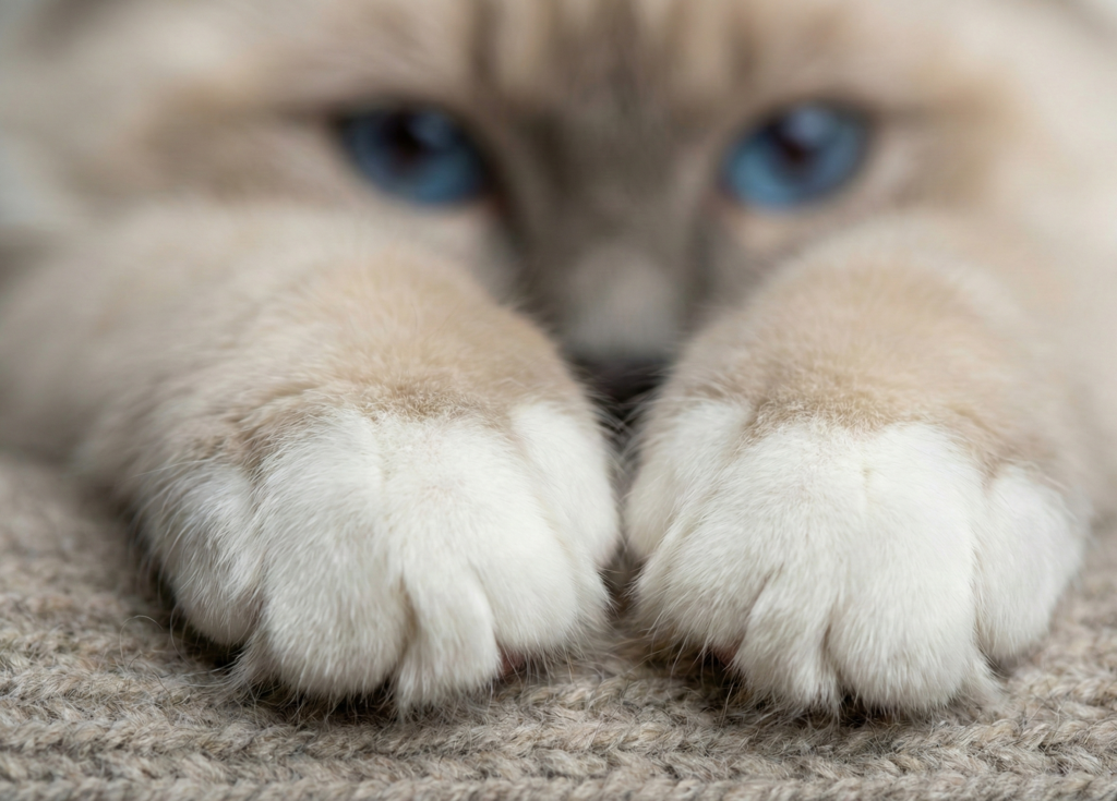 Lo que realmente distingue al Birmano de otras razas son los guantes blancos en sus cuatro patas. Estos «calcetines» deben ser simétricos y puros, sin manchas de color. En las patas traseras, el blanco se extiende formando «espuelas» que suben por el talón. Conseguir esta simetría perfecta es el sueño de cualquier criador.