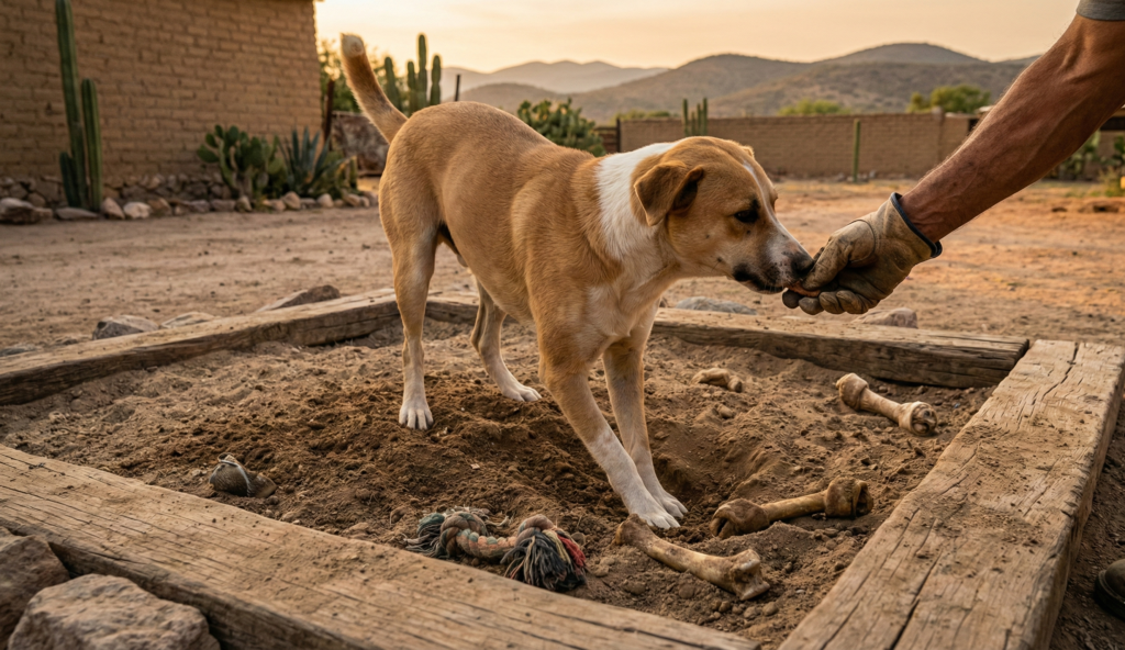 Un perro cansado es un perro feliz y que no cava. Dale tareas: que te acompañe a revisar el ganado, a caminar el terreno, a cargar cosas ligeras. Los perros de rancho necesitan sentirse útiles.